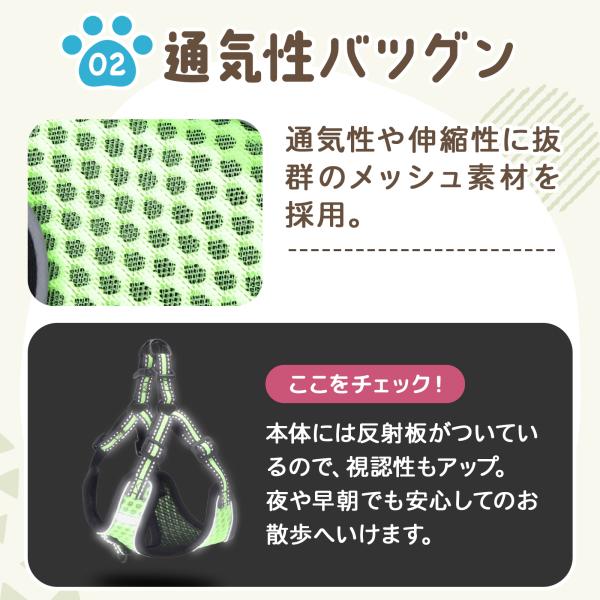メッシュ素材で軽量かつ通気性に優れたハーネス。ペットの快適な散歩をサポート。