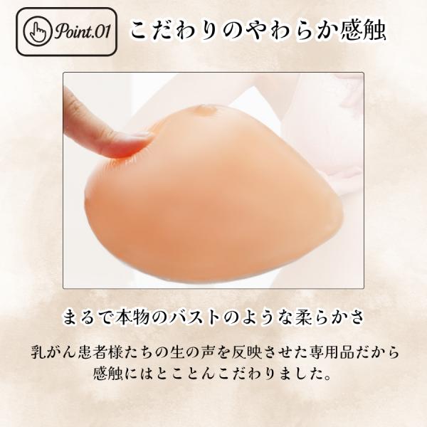 柔らかなシリコン素材を使用し、まるで本物の胸のような自然な質感と丸みを再現。術後のデリケートな体にもやさしくフィットし、安心して日常生活を送ることができます。