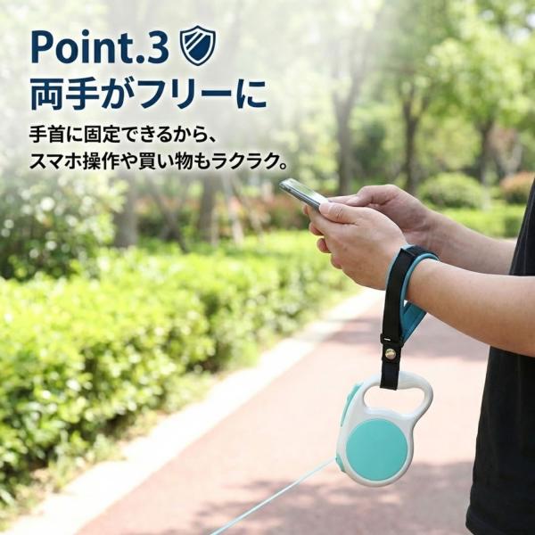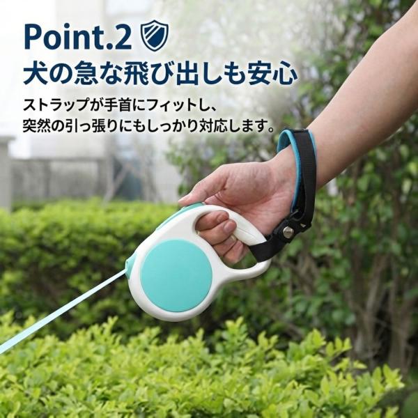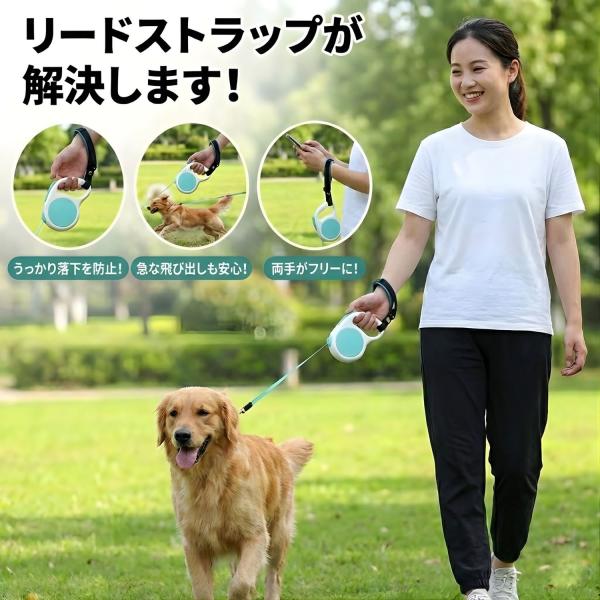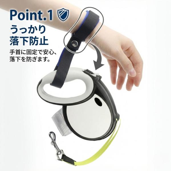 【お散歩の不安をゼロに】 伸縮リード使用時の「うっかり落下」や「急な飛び出し」による事故を防ぐ、専用のリストストラップです。手首に固定することで、愛犬の安全を確実に守ります。