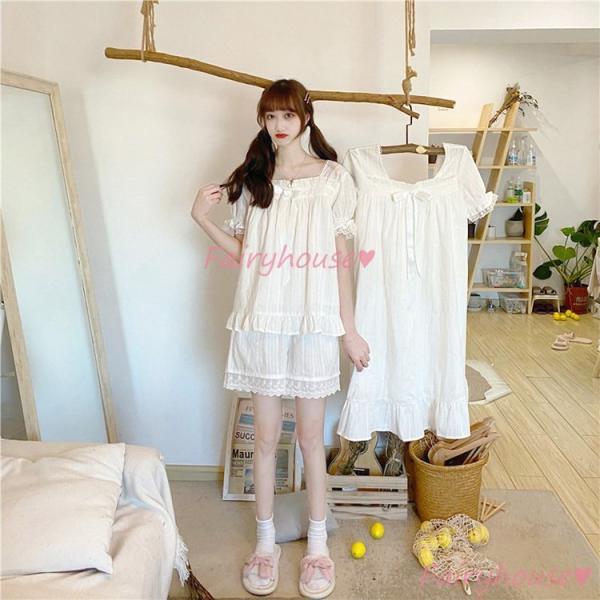 【商品説明】:パジャマ ルームウェア レディース 夏 半袖パジャマ 可愛いルームウェア 白レースフレア ショット丈パンツ上下セット/ネグリジェ ワンピース お姫様 部屋着 大人 韓国風シンプル