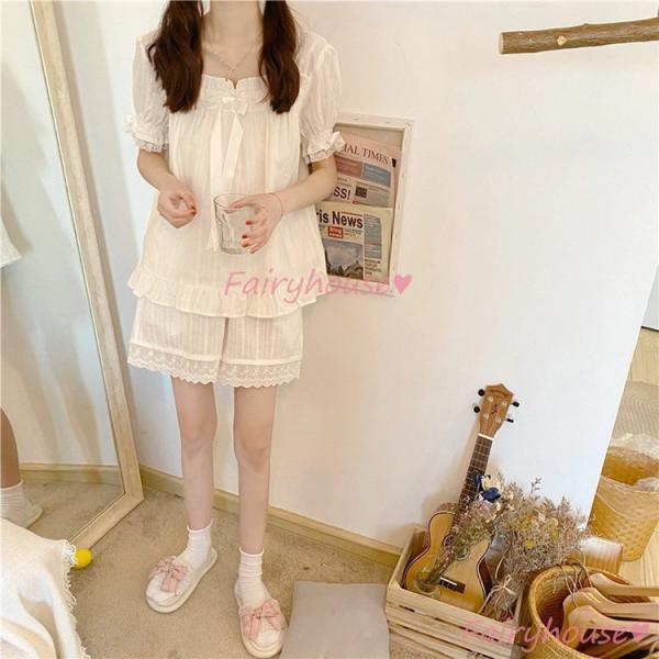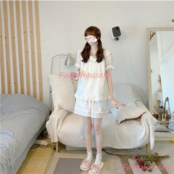 パジャマ 夏 半袖ルームウェア 可愛い白レース 部屋着 韓国風