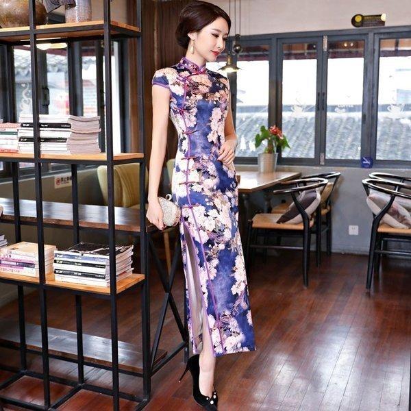 チャイナドレスロング花柄シルクチャイナドレスチャイナ服ロングドレス大きいサイズ半袖パーティードレスコスプレ衣装チーパオChinaDress
