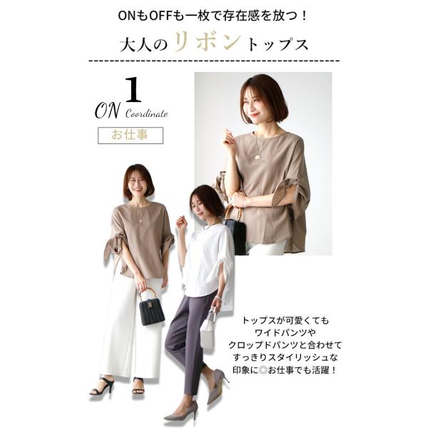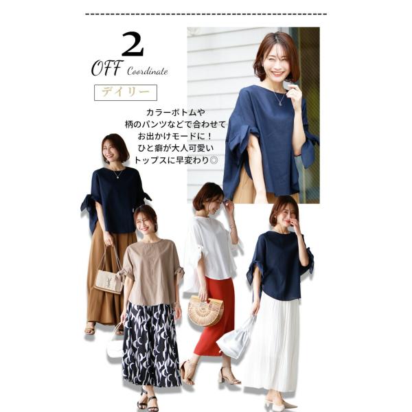 トップス 袖リボン ブラウス リボン モカ ホワイト ネイビー Mocha White Navy 茶 白 青 デザイントップス