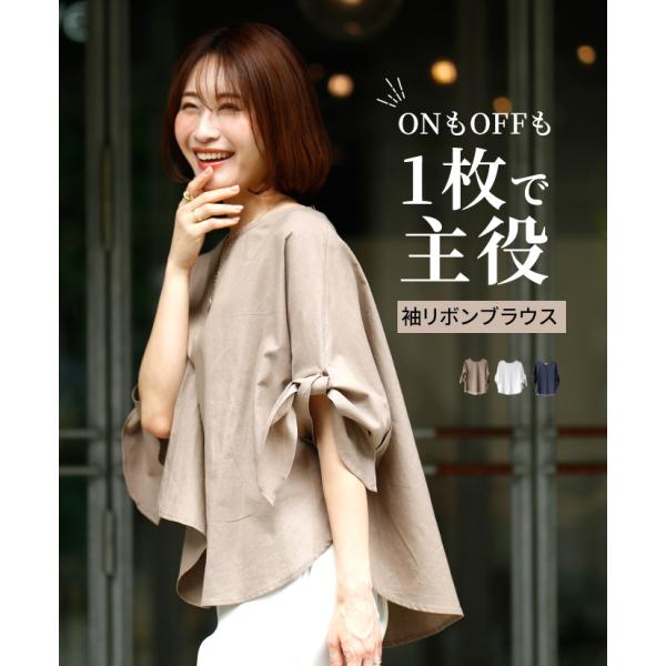 トップス 袖リボン ブラウス リボン モカ ホワイト ネイビー Mocha White Navy 茶 白 青 デザイントップス