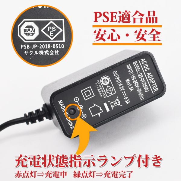4.2V バッテリー充電器 バッテリーチャージャー 充電式投光器 出力 4.2V 500mA AC充電器 AC100V〜240Vに対応 PSE認証済み ACアダプター 代替電源