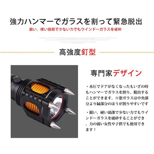 ・交通事故などで車内に閉じ込められた時はヘッドに付いている金具で窓ガラスを割り脱出することができます。