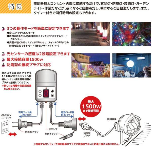 光センサー付きタイマーコンセント 防雨型 12時間 最大1500W 屋外用 消灯時間設定 自動点灯 装飾灯 ガーデンライト 玄関灯 防犯灯 照明器具 作業 SUCCUL