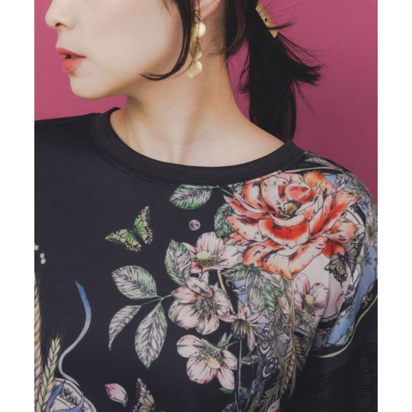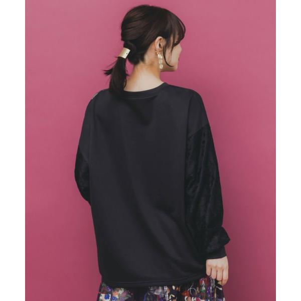 袖にはカットソー生地の上から繊細な花柄レースを重ね、ふわりと優しいフェミニンなデザイン。