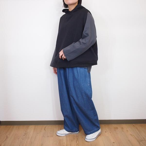 ゆとりあるシルエットで、裾にダーツを入れることで広がりすぎないバランスの良いパンツ。