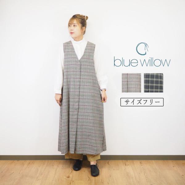 blue willow/ブルーウイロー コットン リネン グレンチェック 比翼開き ジャンパースカート レディース ワンピース