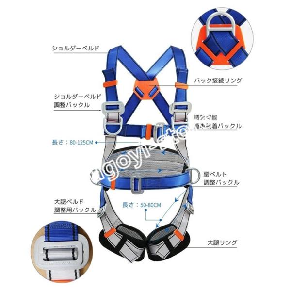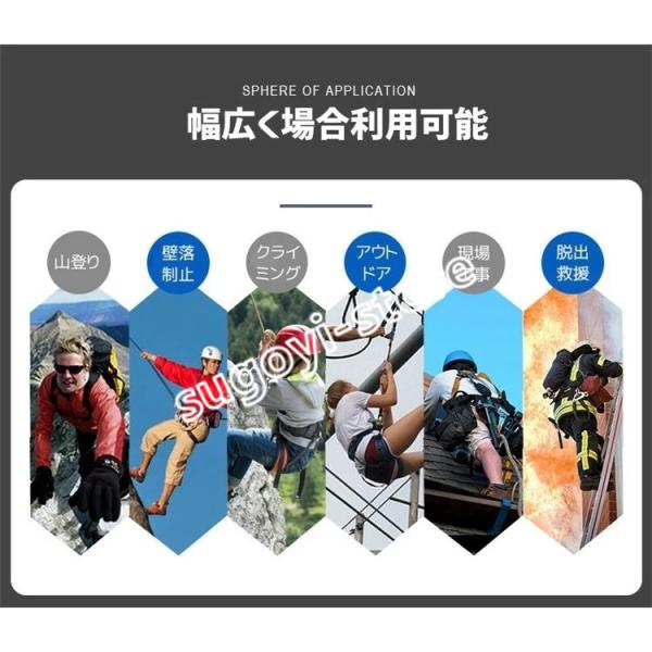 【安全帯利用シーン】 ロッククライミング、屋根の修理、林業伐採、洞窟探検、緊急救助、屋外クライミング、屋内ロッククライミング、ケーブルウェイ、消防、高地、土木工事、造船所、鉱山、橋梁工事や外壁清掃などでの作業に適しています。