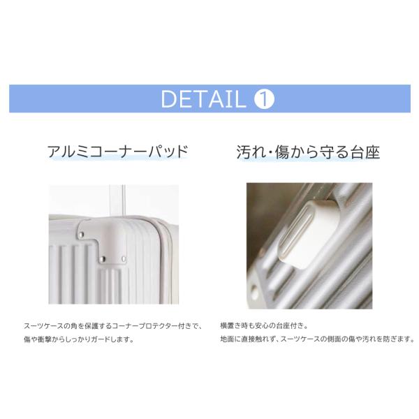 衝撃の受けやすいコーナーパッドは、アルミコーナーパッド搭載!衝撃に強く、スーツケースを守ります。