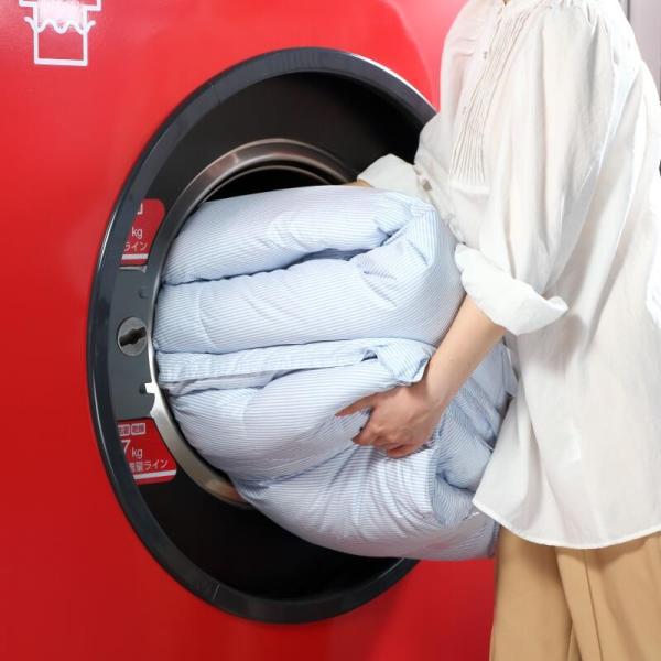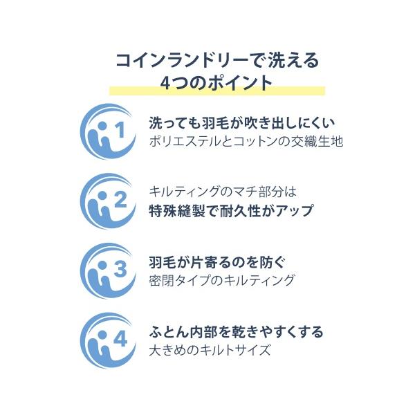 コインランドリーで安心して洗える羽毛布団。繰り返し洗っても、ふんわり感と、暖かさをキープします。