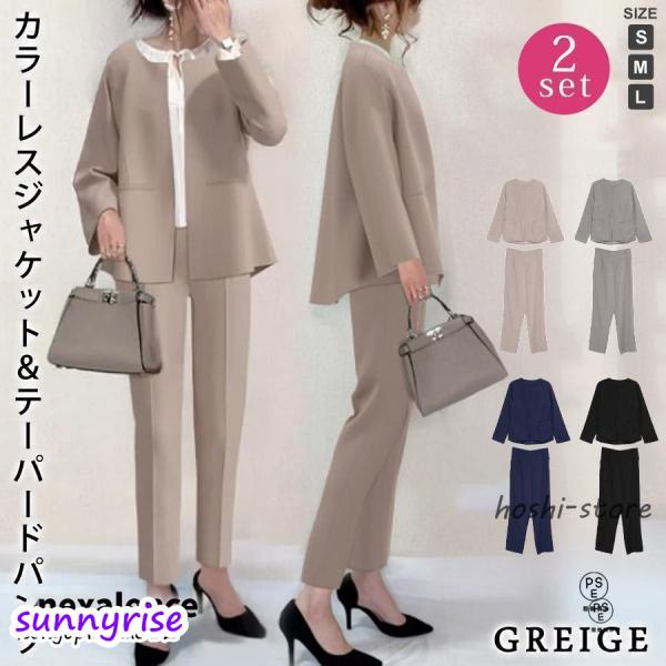 セットアップ レディース スーツ 秋 冬 秋冬 2点セット 黒 紺 ジャケット パンツスーツ ノーカラー スーツ テーパード ブラック ベージュ ネイビー