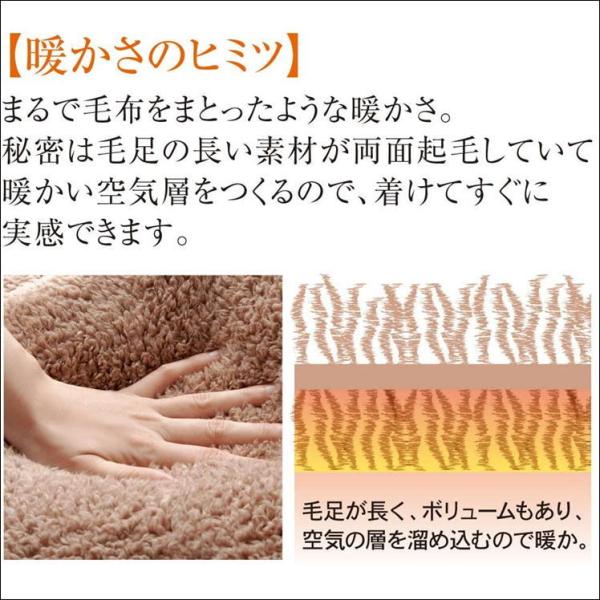 秘密は毛足の長い素材が両面起毛していて暖かい空気層をつくるので。着けてすぐに暖かさが実感できます。