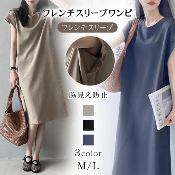 【新品開催10%off】ワンピース 脇見え防止 フレンチスリーブ Tシャツワンピース レディース ミモレ丈 体型カバー 二の腕カバー ゆったり クルーネック 爆買