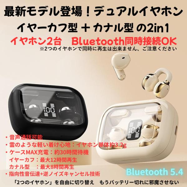 検索用:ワイヤレスイヤホン 2in1 イヤーカフ カナル型 デュアル Bluetooth 耳を塞がない ノイズキャンセリング 長時間再生 交互使用で充電切れなし iPhone/Android対応