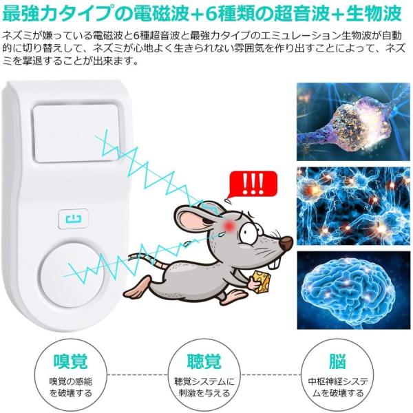 他社の駆除製品は電磁波と4種類の超音波を発信するだけで、この製品はネズミが嫌っている電磁波と6種超音波、強力タイプのエミュレーション生物波が