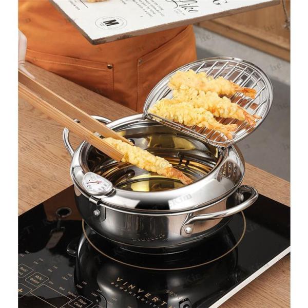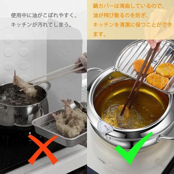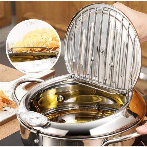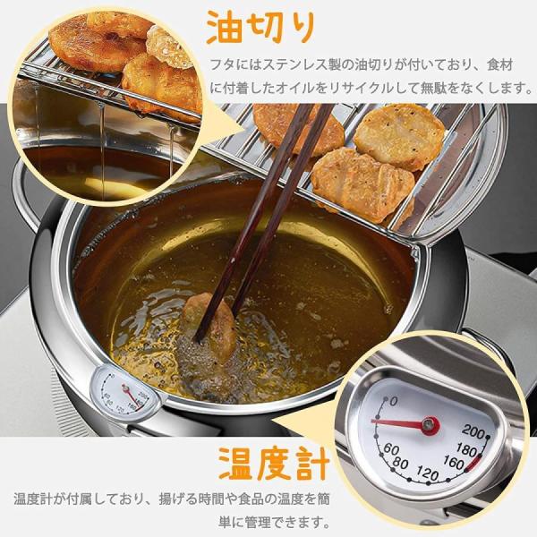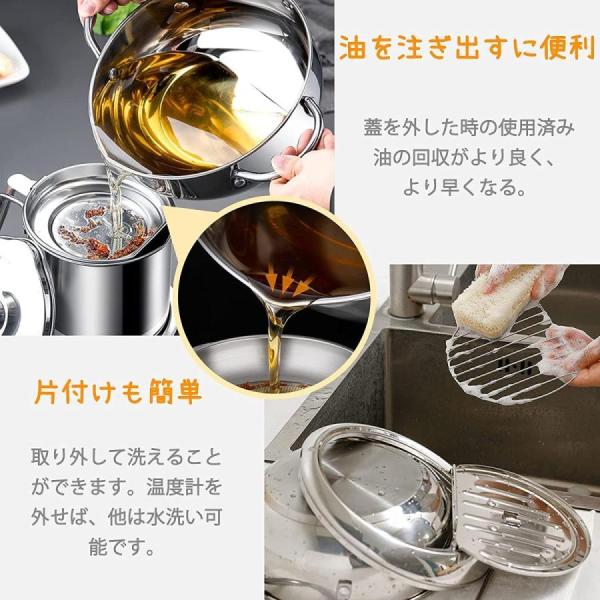 【油切りと温度計】フタにはステンレス製の油切りが付いており、食品から余分な油脂を排出することができ、操作は簡単です。温度計が付属しており、揚げる時間や食品の温度を簡単に管理できます。