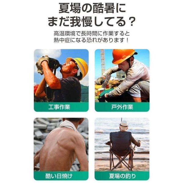 服の中に外気を取り入れ、体の表面に大量の風を流すことにより、汗を気化させて、涼しく快適にすごしていただくための製品です。冷感スプレーや保冷剤などと一緒に使用しますと、更に効果アップ