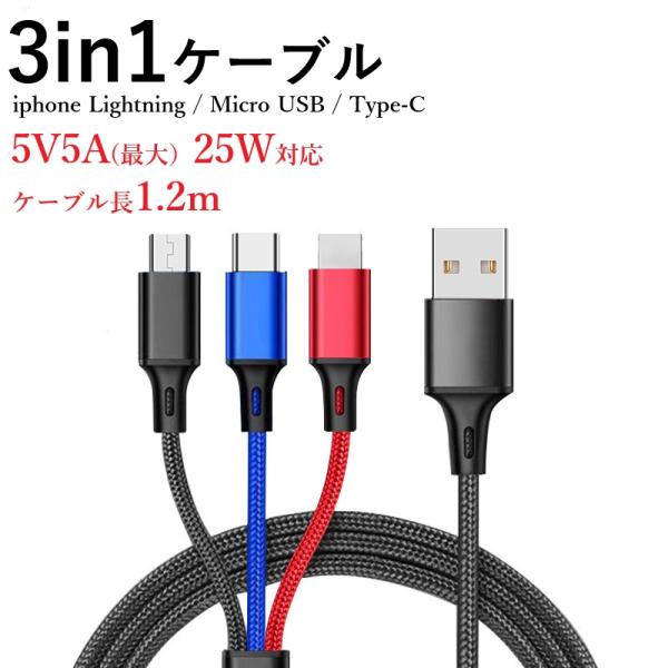 充電ケーブル 3in1 5V 5A 25W対応 iPhone Android micro USB Type-C USBケーブル モバイルバッテリー 充電器 ポイント消化 ポイント利用 Z