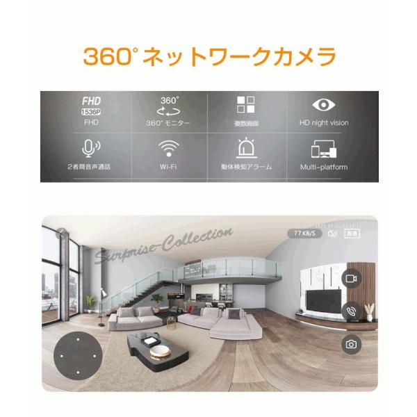 防犯カメラ 360度 500万画素 Wifi 常時録画 SDカード録画 動体検知 赤外線 双方向音声 屋内 監視カメラ v380アプリ AP機能