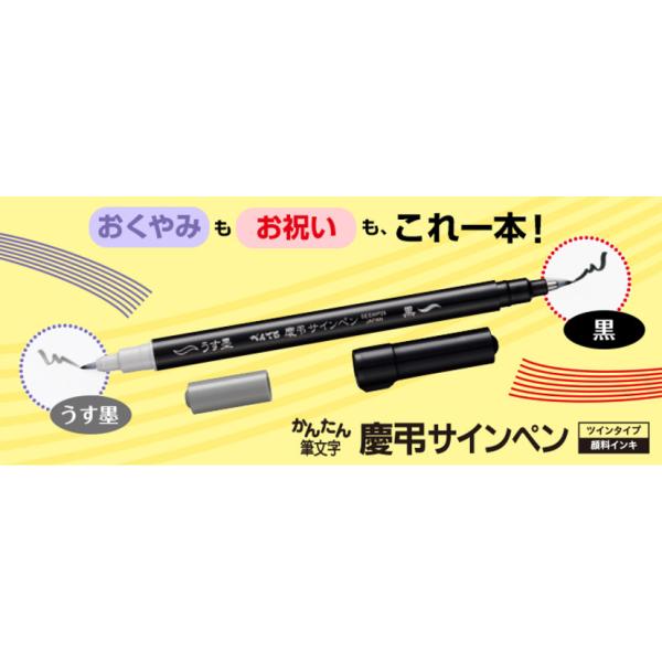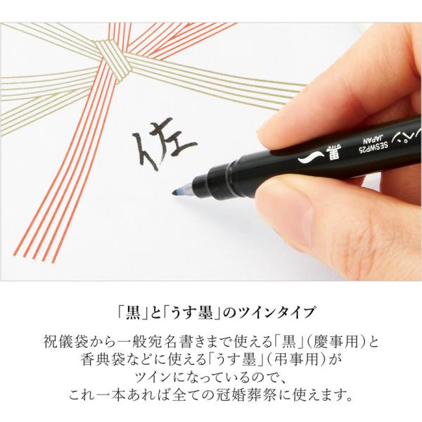 香典袋等に使用できる「うす墨」(弔事用)がツインになっていますので、これ一本ですべての冠婚葬祭にご使用いただけます。