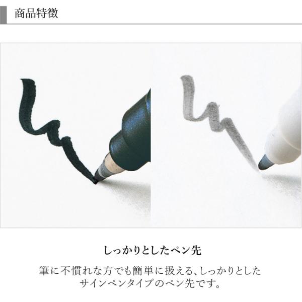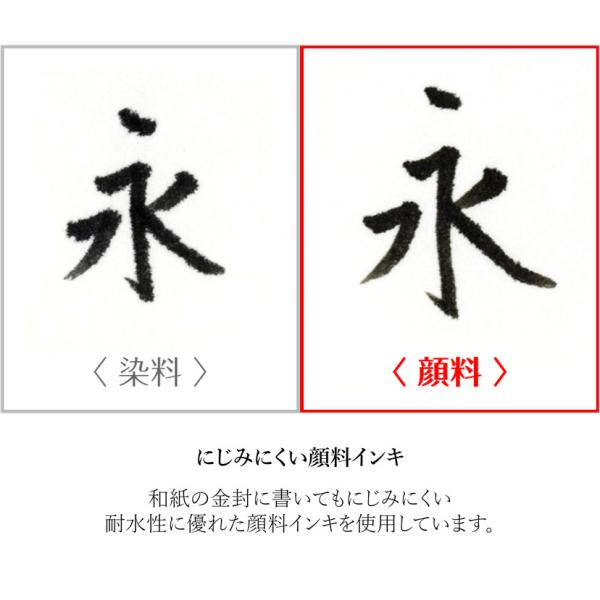 しっかりとしたペン先で、筆に不慣れな方でも簡単に扱えます。和紙の金封に書いてもにじみにくい、耐水性に優れた顔料インキを使用しています。