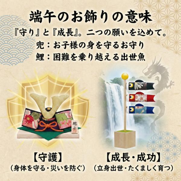 ◆兜と鯉のぼりの両方が楽しめる 男の子の身を守る「兜」と、立身出世を願う「鯉のぼり」。 端午の節句に欠かせない二つの飾りがセットになりました。