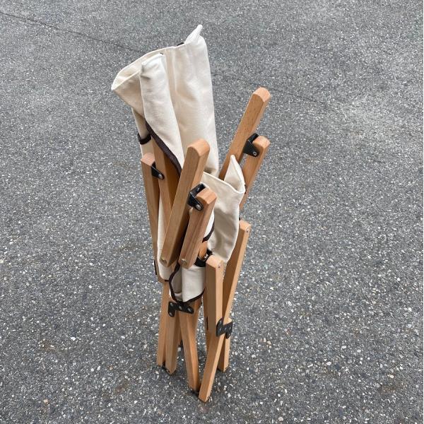 木製アウトドア用折り畳みチェア収納袋付き■サイズ足の巾45cm足の奥行き52cm背もたれの高さ85cm畳んだ時の高さ100cm■重さ収納袋含んで約5kg■材質フレーム ブナ材透明塗装座面背面 帆布(綿)収納袋 帆布(綿)■耐荷重100kg