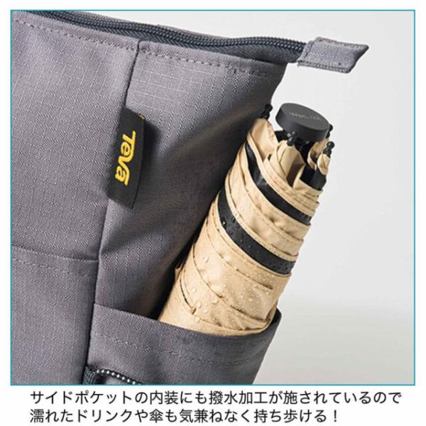 水に強いトートバッグは、サイドポケットの内装にも撥水加工が施されているので、濡れたドリンクや使ってすぐの折りたたみ傘も気にせず収納できる優れもの。