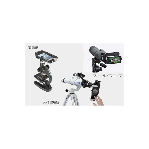 スマートフォン(カメラ付)を天体望遠鏡など光学機器に取付けて撮影できます。適合条件を満たしていればフィーチャーフォンなどスマートフォン以外の端末でも撮影できます。