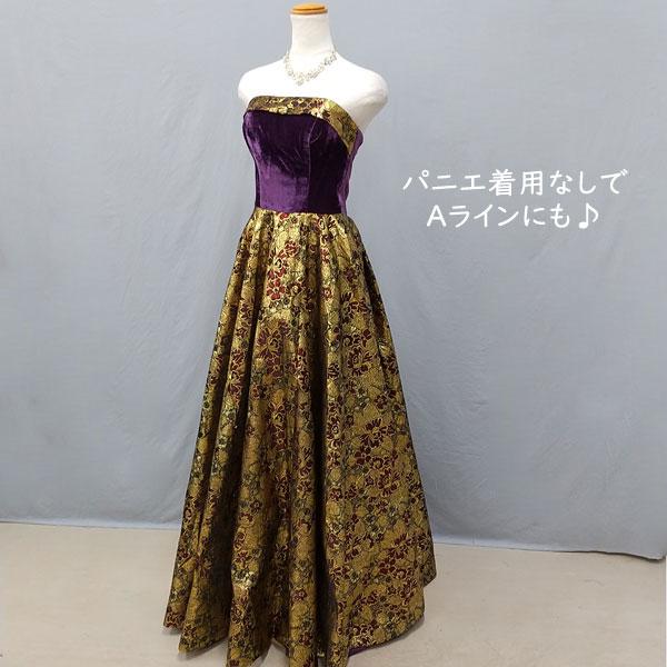 和柄のゴールドの生地のスカートが豪華な印象のロングドレスです。