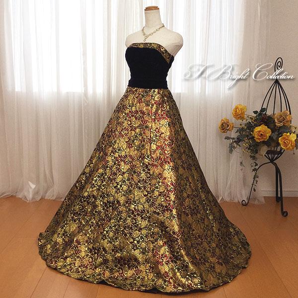 和柄のゴールドの生地のスカートが豪華な印象のロングドレス
