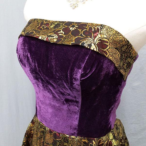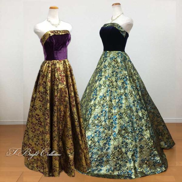 カラードレス 演奏会 ピアノ発表会 ステージ衣装 舞台衣装 和柄ゴールド 紫 青のコーデュロイの胸元 ロングドレス cd80026