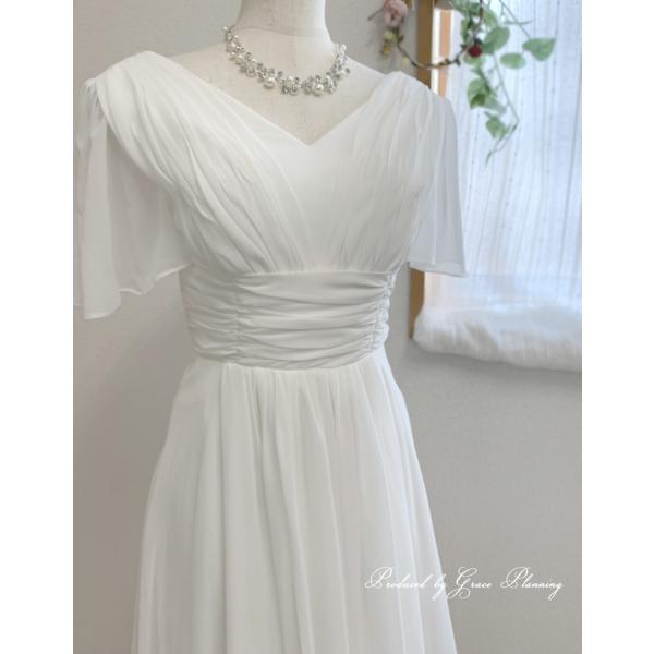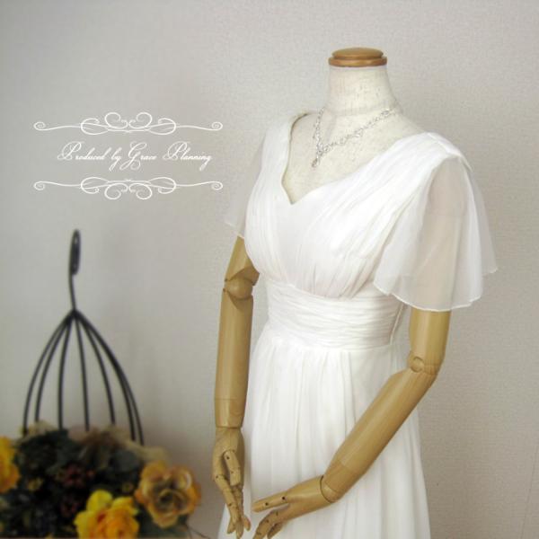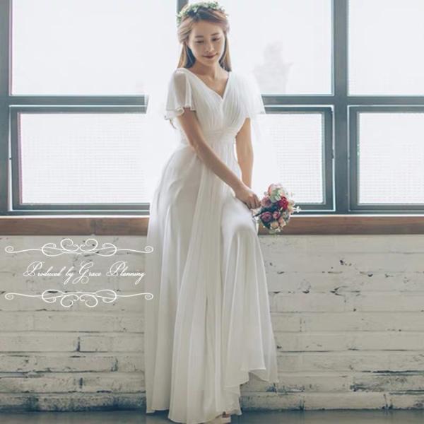 シフォン生地のVネックのスレンダーラインのシンプルなウエディングドレスです。