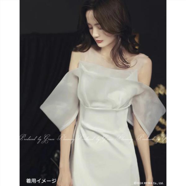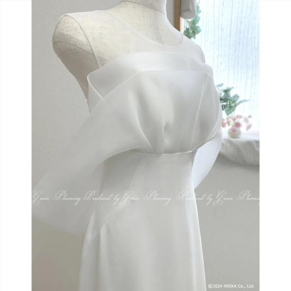 胸元から繋がるオフショルダーでバストラインを隠し、デコルテが綺麗に見えます。