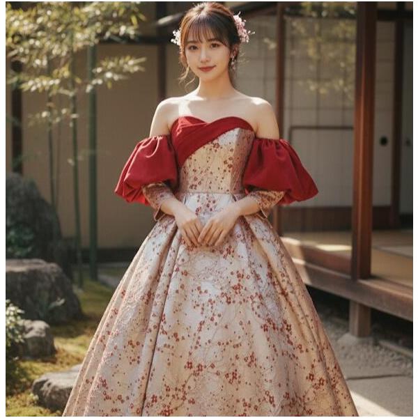 カラードレス 赤 ピンク × レッド 付け袖 取り外し可 ロングドレス 花柄 ウェディングドレス 結婚式 花嫁 前撮り 発表会 演奏会ドレス 即日発送 cd23515