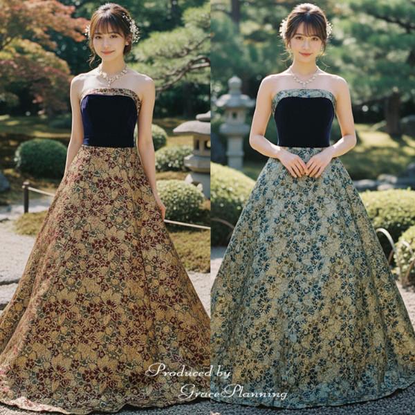カラードレス 演奏会 ピアノ発表会 ステージ衣装 舞台衣装 和柄ゴールド 紫 青のコーデュロイの胸元 ロングドレス cd80026