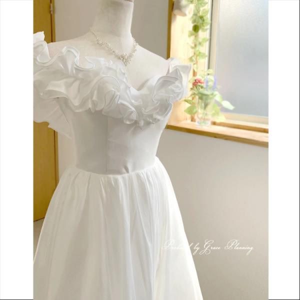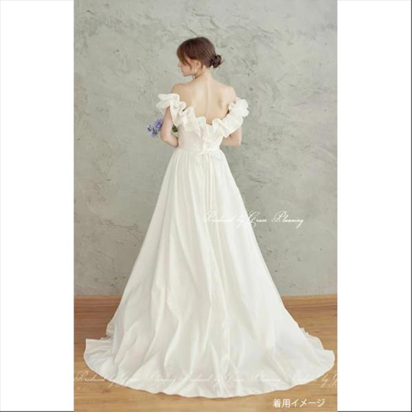 デコルテから背中ラインまで続くフリルがキュートなウェディングドレスです。
