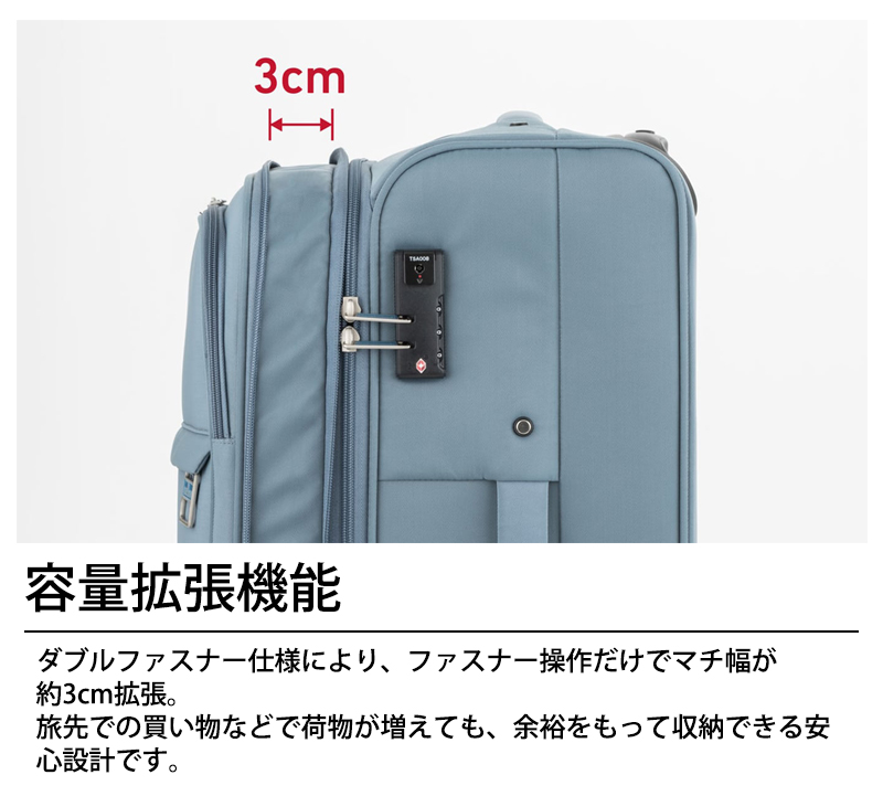 ・ダブルファスナー仕様の容量拡張機能(マチ約3cmアップ)