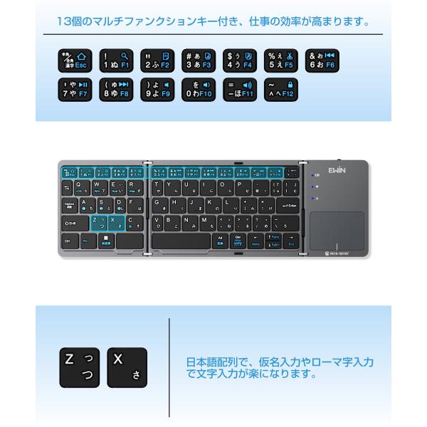 Bluetooth キーボード 折りたたみ 日本語配列 ワイヤレスキーボード タッチパッド付き ブルートゥース iOS Android Windows Mac iPhone スマホスタンド付き