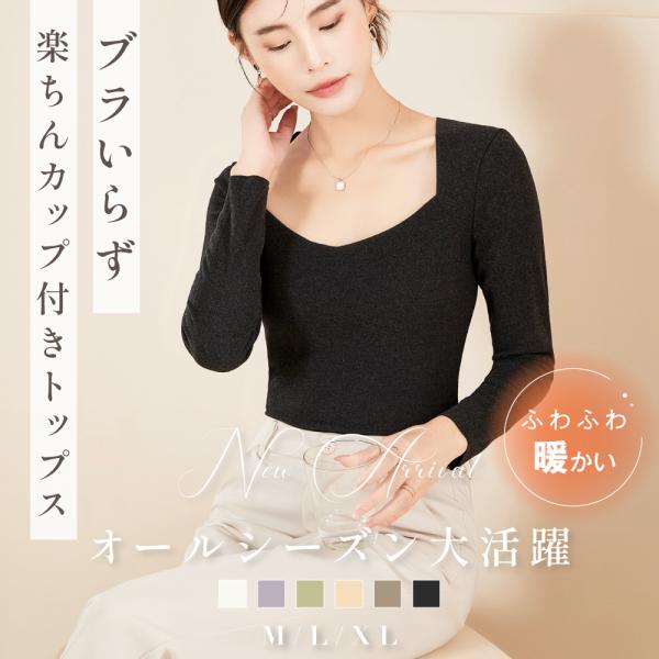 ニット インナーカップ付き トップ 長袖 肌着 Vネック 暖か