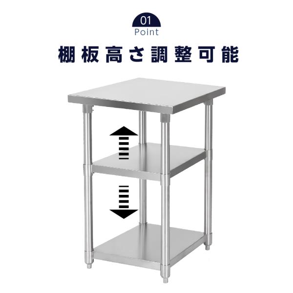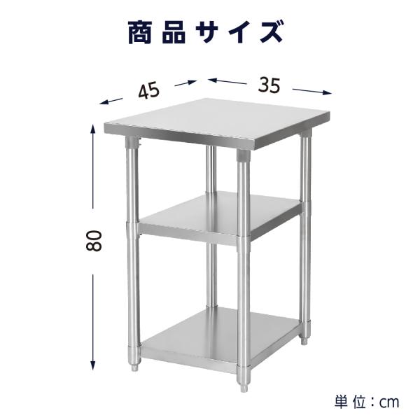 【製品仕様】本体サイズ:W35×H80×D45cm / 材質:天板:ステンレスSUS430 脚:ステンレスSUS201、梁:スチール アジャスト脚:ステンレスSUS201/PVC / 仕様:組立式 / 付属品:六角レンチ