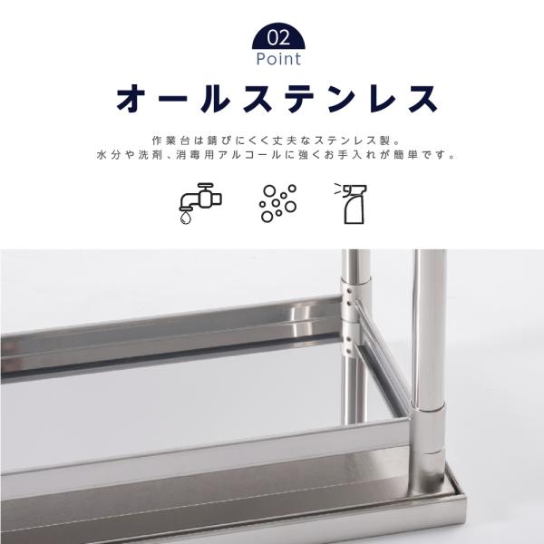 【製品の強み】安心の日本製 ステレンス製のキャスター付き作業台 高品質のステレンス製で、耐食性、お手入れが簡単、酸化防止剤、水洗いが可能です。