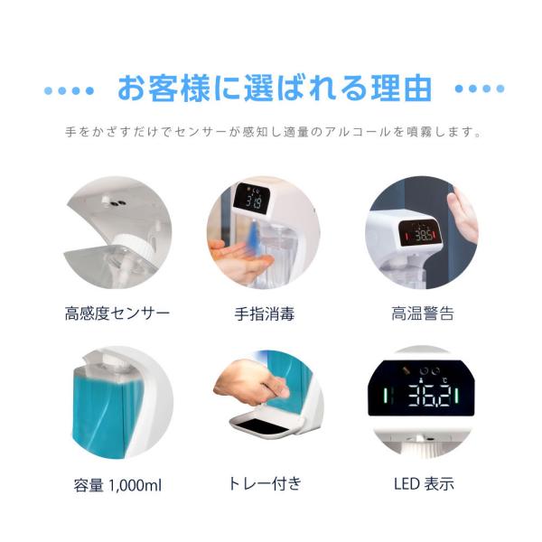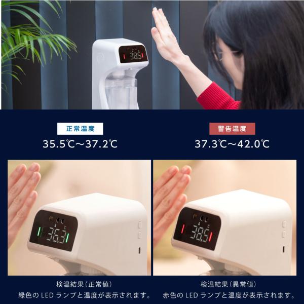 【商品の強み】赤外線センサーで即時に反応どこでも手をかざすだけで即反応、液を噴射します。どこにも触れないので、安心できます。赤外線感知距離5cm〜10cmで反応し、0.5秒でに液を噴出、手に擦り込むことができます。さらに、わずか1秒で体表温度を測定することが可能なので、感染リスクを効果的に防ぎます。