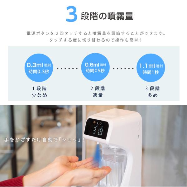 【大容量1000ml】本製品につきまして、大容量の1000mlタンクを付いており、 0.3ml / 0.6ml / 1.1ml の 3段階の噴霧量でタッチするだけで噴霧量を調節することができ、お好みの噴霧量に合わせて家庭、学校、会社、病院などの公的場所で活用頂ける製品です。