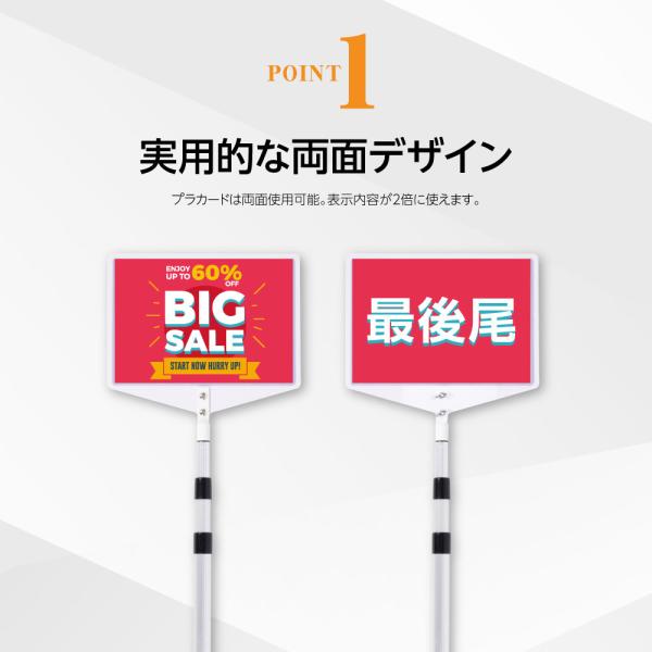 ※両面&軽量設計:プラカードは両面使用可能。表示内容が2倍に使えます。軽量設計で全てのパーツが分割できるため、持ち運びや収納がとても便利です。