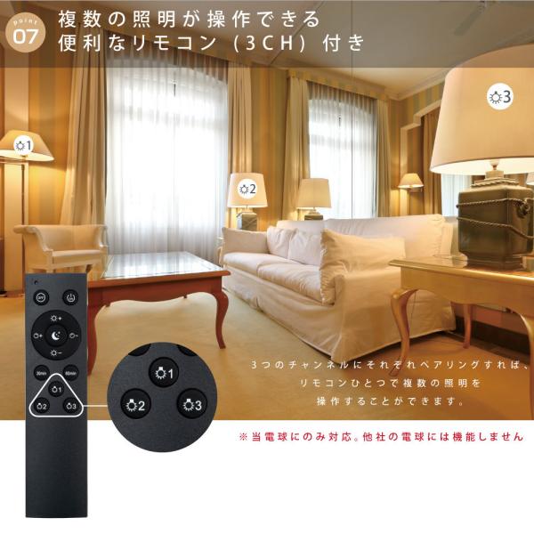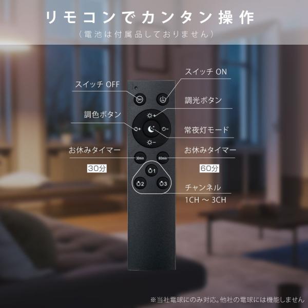 対応電球に交換する事で、壁スイッチやプルスイッチで点灯・消灯するタイプの照明器具がリモコン操作できるようになります。リモコンには3つのチャンネルがあり、それぞれにペアリングすることで複数の照明の操作が可能です。