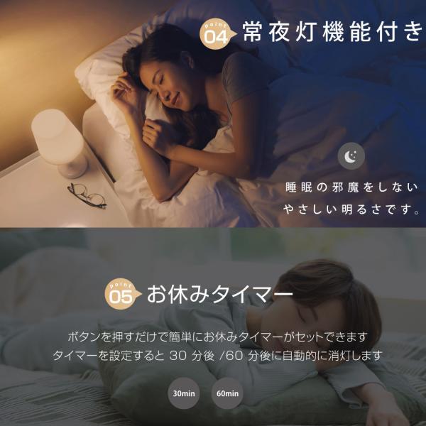 調光は、100%全灯〜0%の間で無段階で調節できます。調光機能とは別に就寝時用の常夜灯もあります。30分と60分のお休みタイマーが付いているので、寝落ちしてしまった時の消し忘れも防げます。
